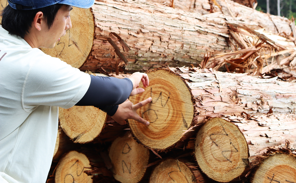 ▲加工について説明してくださっているプランナーさん。丸太の中心の数字は直径(センチ)を表している。