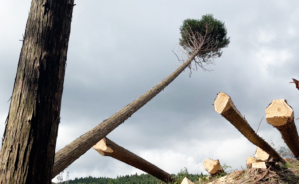 ▲重厚な音とともにゆっくりと倒れていく約20Mの大木は大迫力