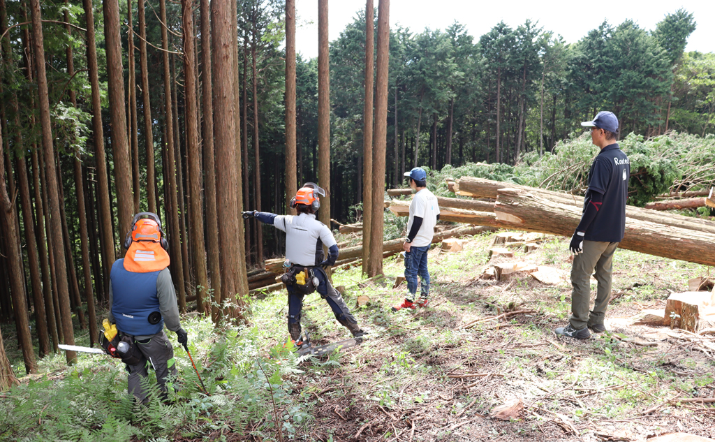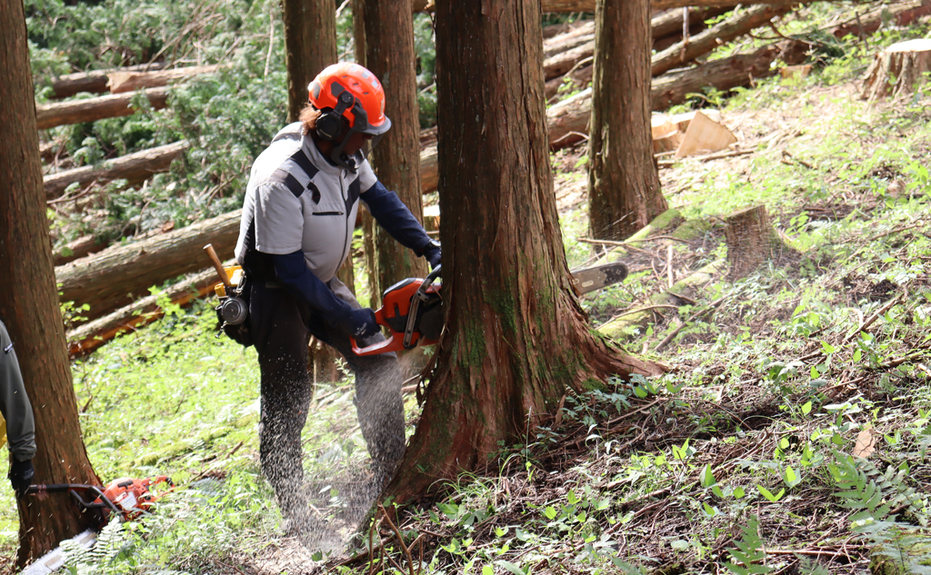 取材当日は、主伐(しゅばつ:木をまとめて伐る作業)の予定が組まれたエリアでチェーンソーを使って作業をする方々が。