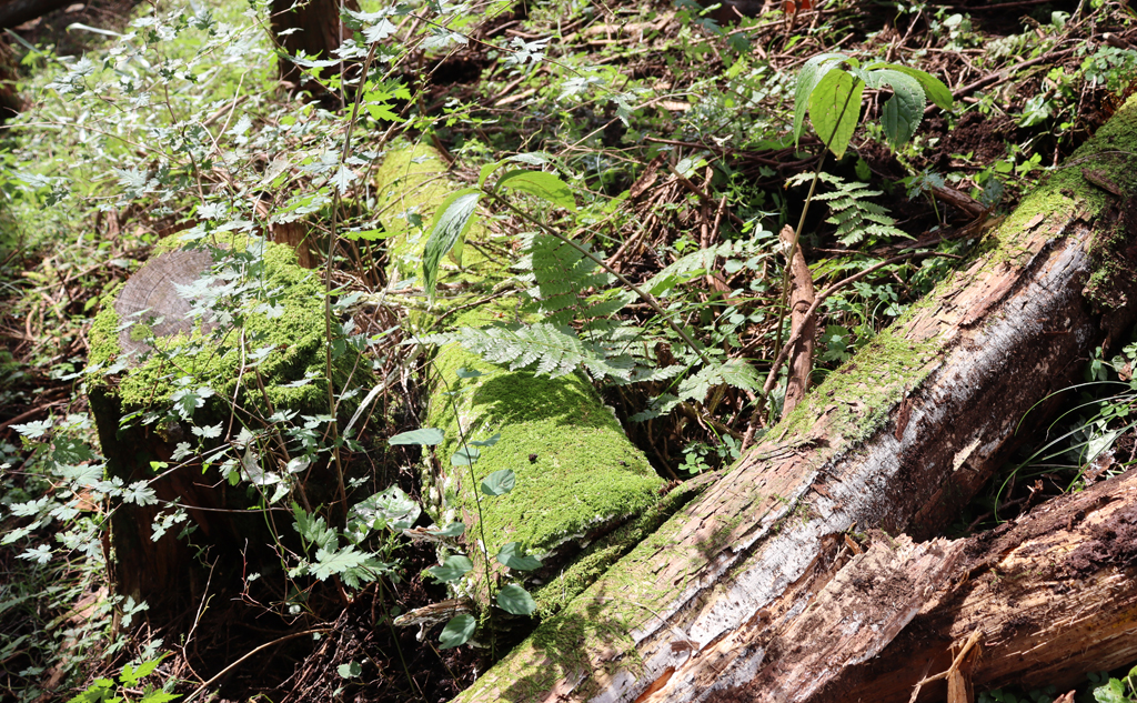 ▲主伐のあとに残った切り株や、規格外で商品にならないために残された木は長い時間をかけ自然に還っていく。