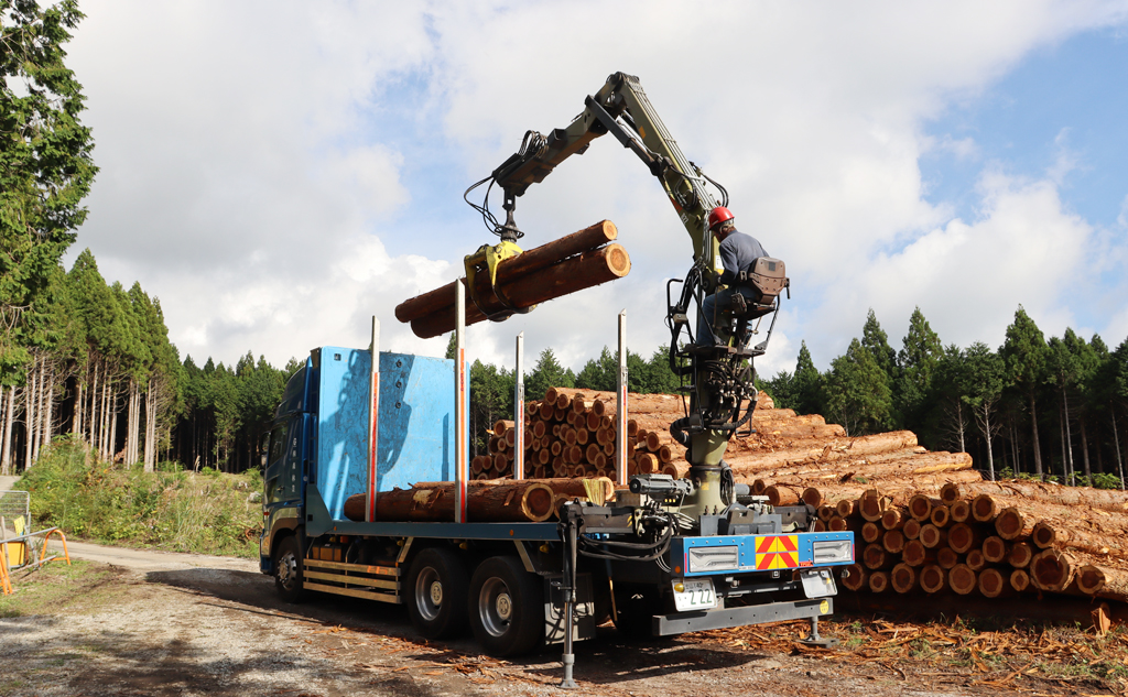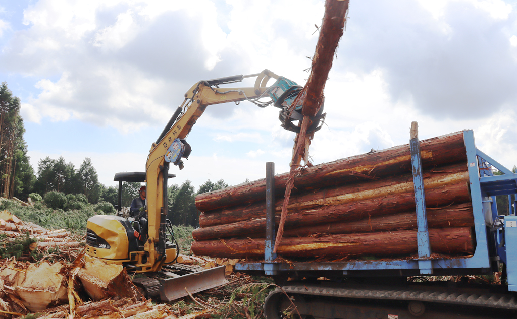 伐採された丸太はその場で終わりではありません。丸太を掴む林業専用機械「グラップル」で伐出作業し、トラックへの積み込みや運搬といった次の工程へとスムーズに移り、やがて建材や製品など、私たちの生活に欠かせないかたちへと生まれ変わっていきます。