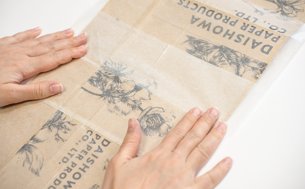 紙袋のサイズに合わせてカットしながら、ワックスペーパーのざらざらした面と紙袋を貼り合わせていきます。紙に蝋を染み込ませたワックスペーパーは、テープやのりが付きにくいので、しっかりとおさえましょう!