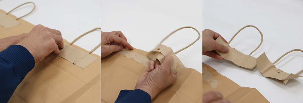・パッチの端からゆっくり剥がし、紙袋本体を破かないように気をつけます。
