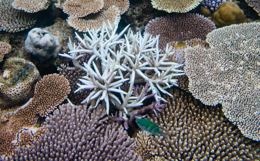 二酸化炭素が海水へ溶け込むことによって、海洋酸性化が起こります。海に溶けた二酸化炭素は、海中の海藻などによって吸収されるものの、濃度が高くなり過ぎると処理が追いつかなくなります。処理ができなかった二酸化炭素は、炭酸イオンとして存在し、電離によって海中のpHを低くすることで海水が酸性化します。海洋酸性化は海の生態系に影響し、甲殻類や貝類、サンゴの生育を妨げることが懸念されています。これは酸性化によって殻などの主成分である炭酸カルシウムが溶けてしまうために起こります。