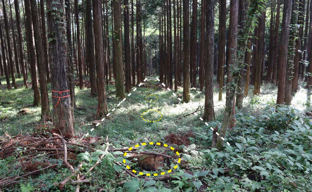 次に案内していただいたのが間伐を行ったエリアと、まだ間伐が行われていないエリア。「間伐」とは森林の成長過程で木が密集しすぎないように一部を伐採する作業です。今回見学した場所では間伐の前後で光の差し込み方がまるで別世界のようでした。