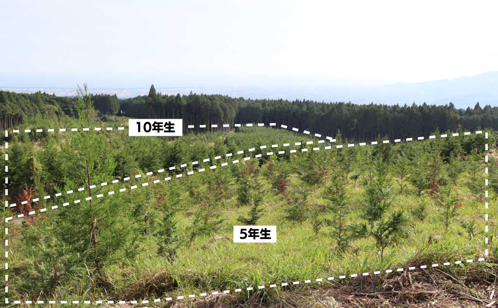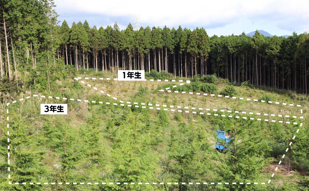 そんな中、まず案内していただいたのは植樹から1年経過した1年生、3年生、5年生、10年生の木が範囲ごとに時期で区切られた植樹エリア。ある程度の高さに達する5年生くらいまでは成長の妨げになる草を刈る「下刈り(したがり)」や、苗木を守るための「獣害対策」が必須とのことでした。植樹した後も人による地道な手入れが欠かせません。