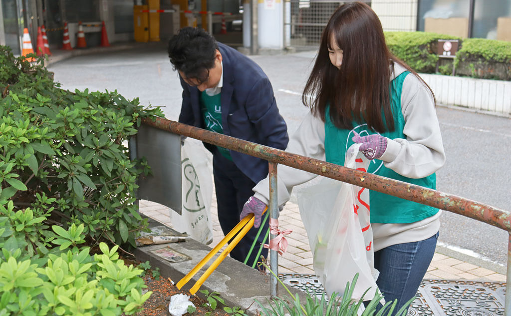 植え込みを中心に、たばこの吸い殻やペットボトルのキャップなど、小さなごみを丁寧に拾っていきます。