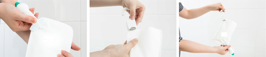 詰め替えパックをぶら下げることで、中のシャンプーや洗剤が、重力でポンプの方へ。中身を最後まで無駄なくキレイに使い切ることができて、環境にもお財布にも優しいんです。また、ワンプッシュで丁度いい量が出てくるので、シャンプーやコンディショナーの出し過ぎも防げます。