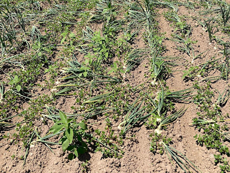 ▲干ばつで土がカラカラになり倒れる玉ねぎ