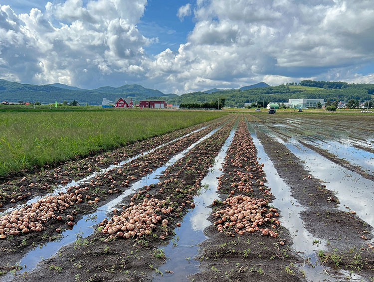 さらに8月の集中豪雨が追い打ちをかけ、収穫直前の畑が水没し多くの玉ねぎが被害を受けました。
