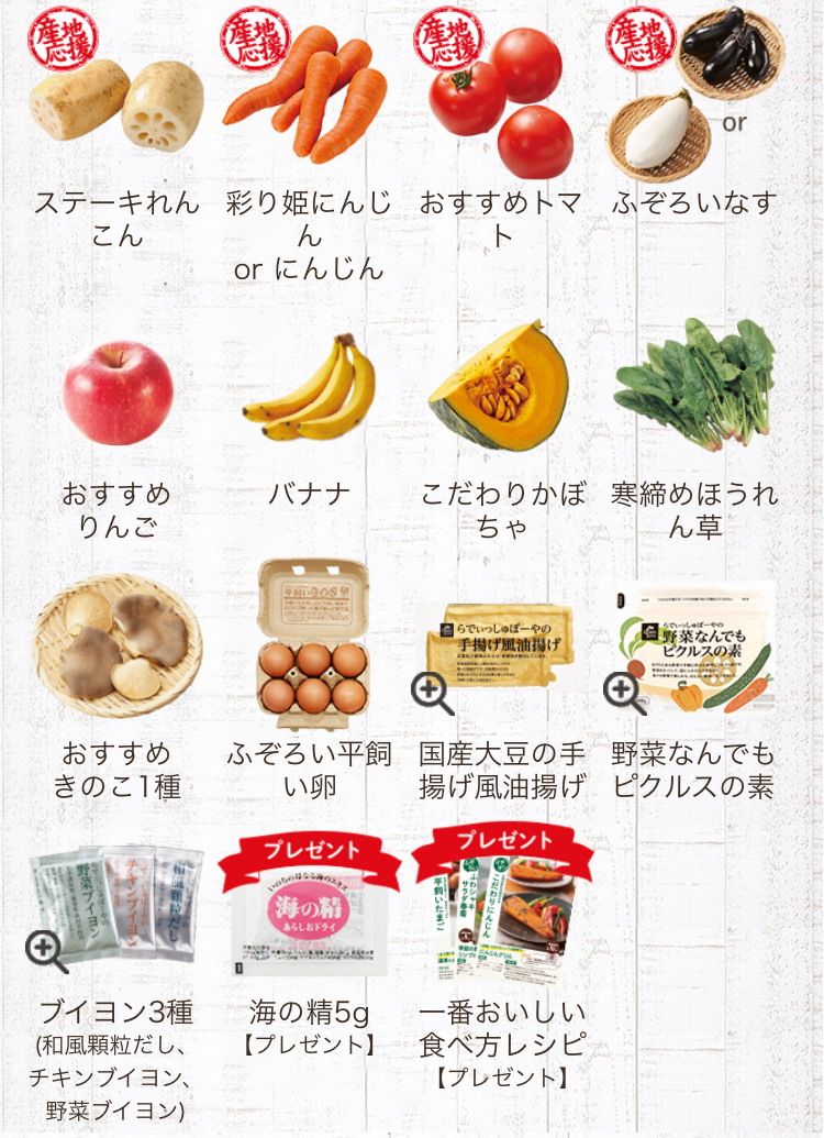 北海道産ふぞろい小玉ねぎ、温州みかん、こだわりにんじん、ステーキれんこん、藤くるり大根、ふぞろいなす(白茄子)、黒あわび茸(きのこ)、おすすめ葉物、こだわりかぼちゃ、野菜なんでもピクルスの素、国産大豆の手揚げ風油あげ、平飼い卵(6個入り)、ブイヨン3種、海の精あらしお5g、一番おいしい食べ方レシピ