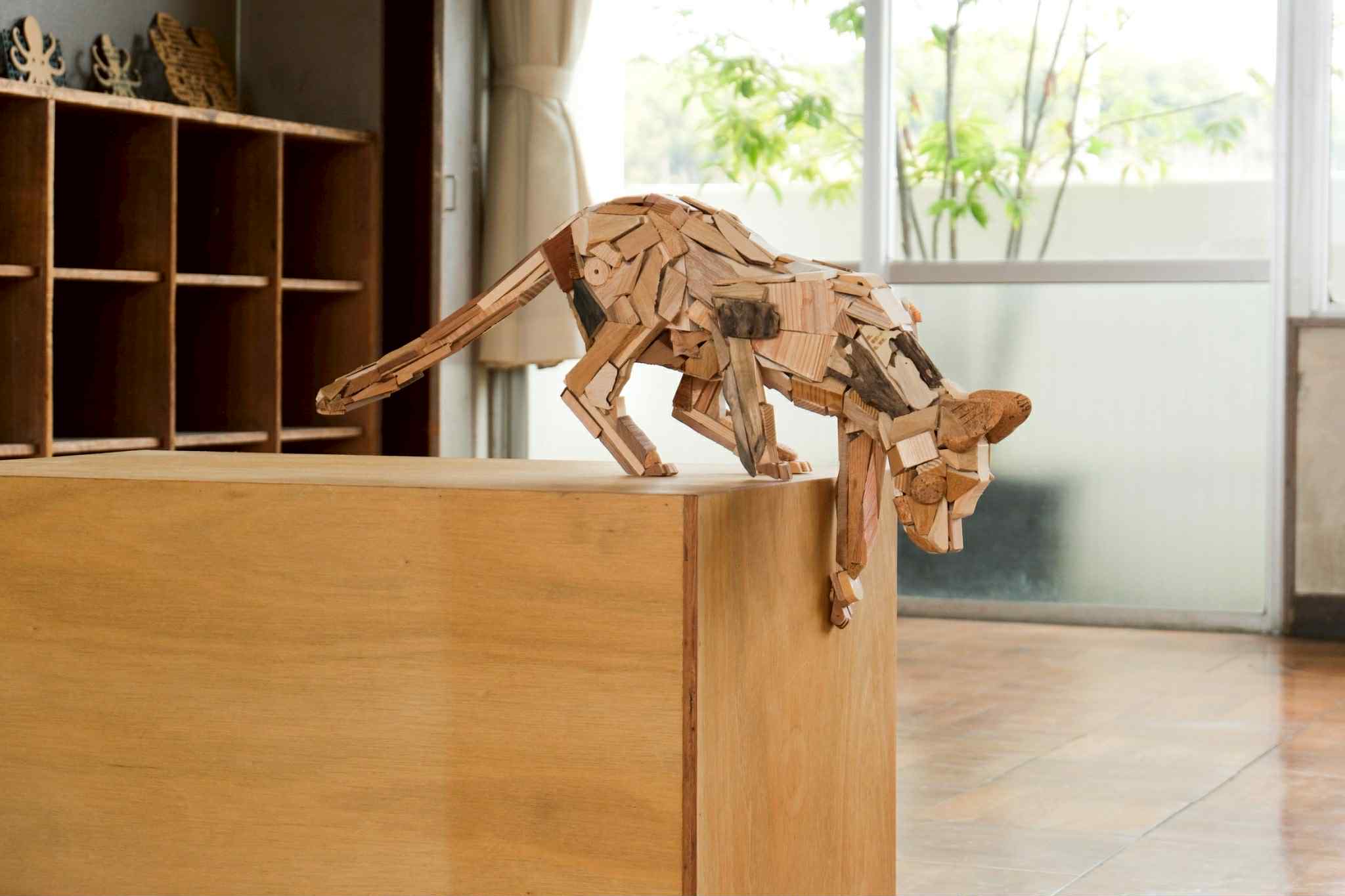 使用するのは、流木や家具の端材、建築現場で出る余り木など、役目を終えた木材です。無骨で角ばった木のブロックをパズルのように組み合わせる独自の手法で、驚くほど柔らかく、生き生きとした動物の曲線美を生み出します。