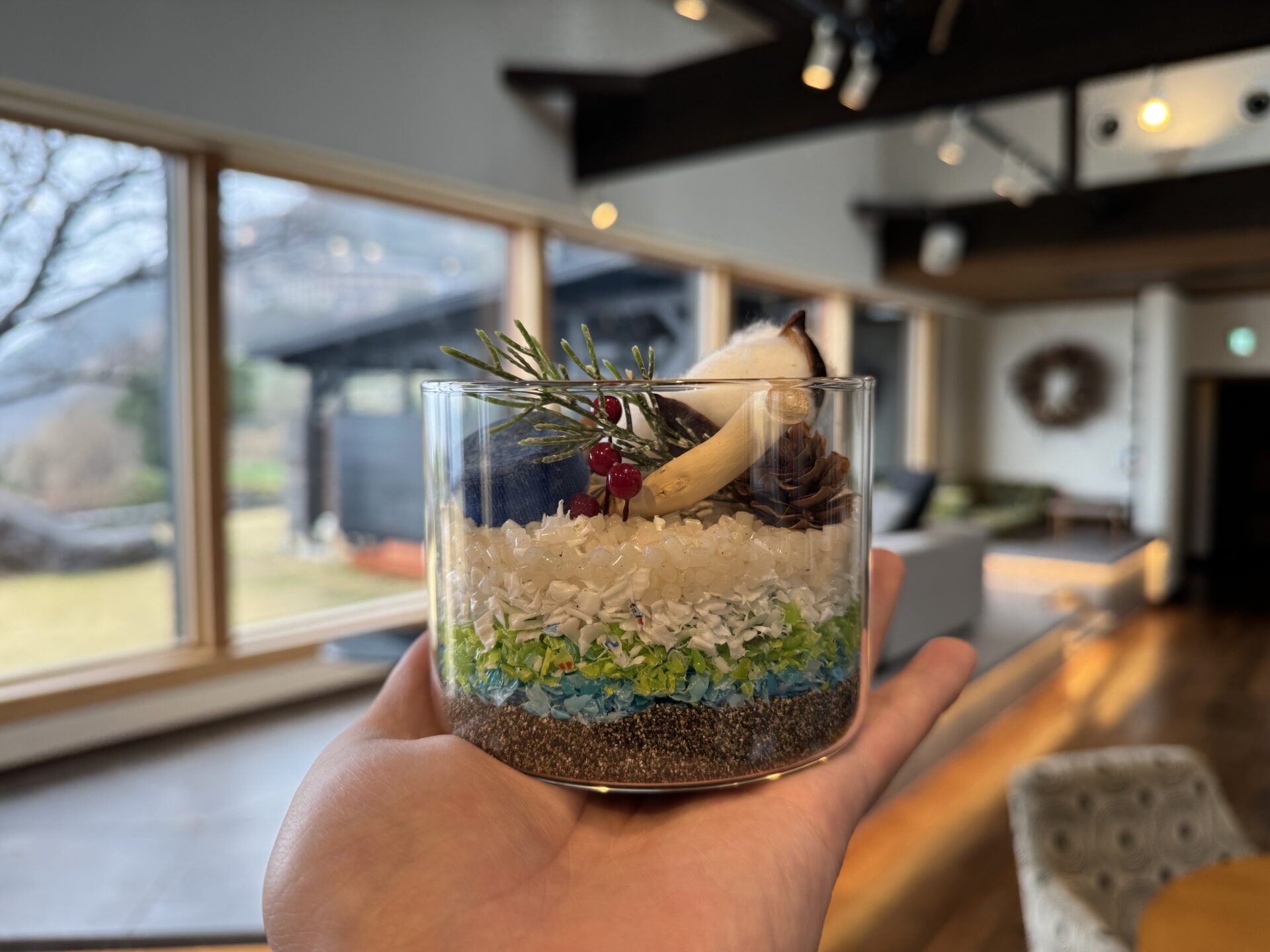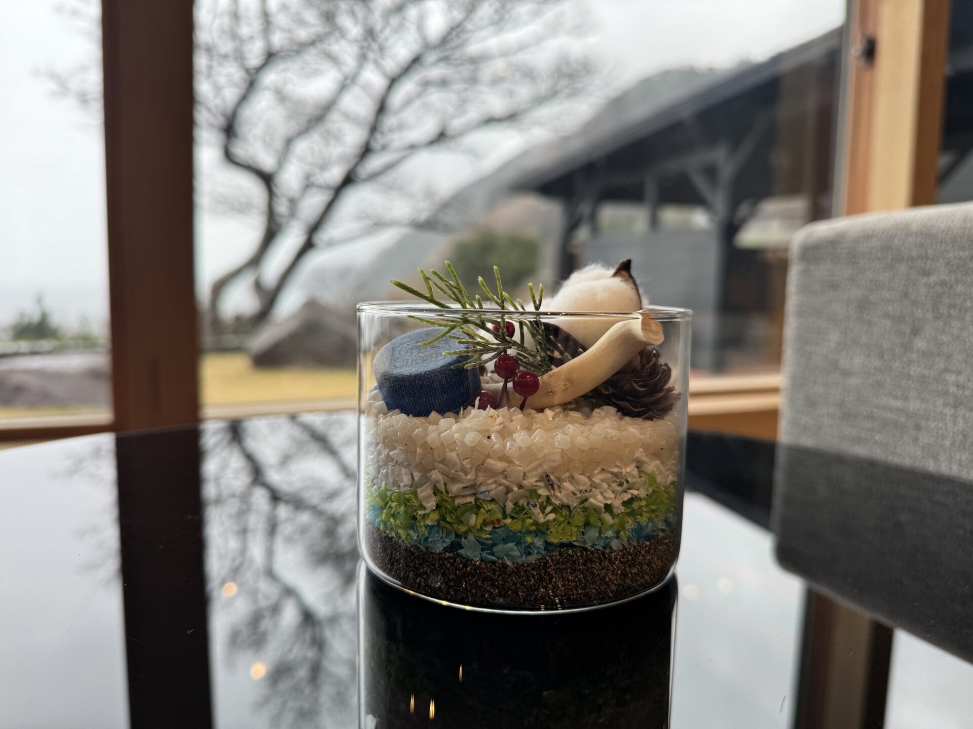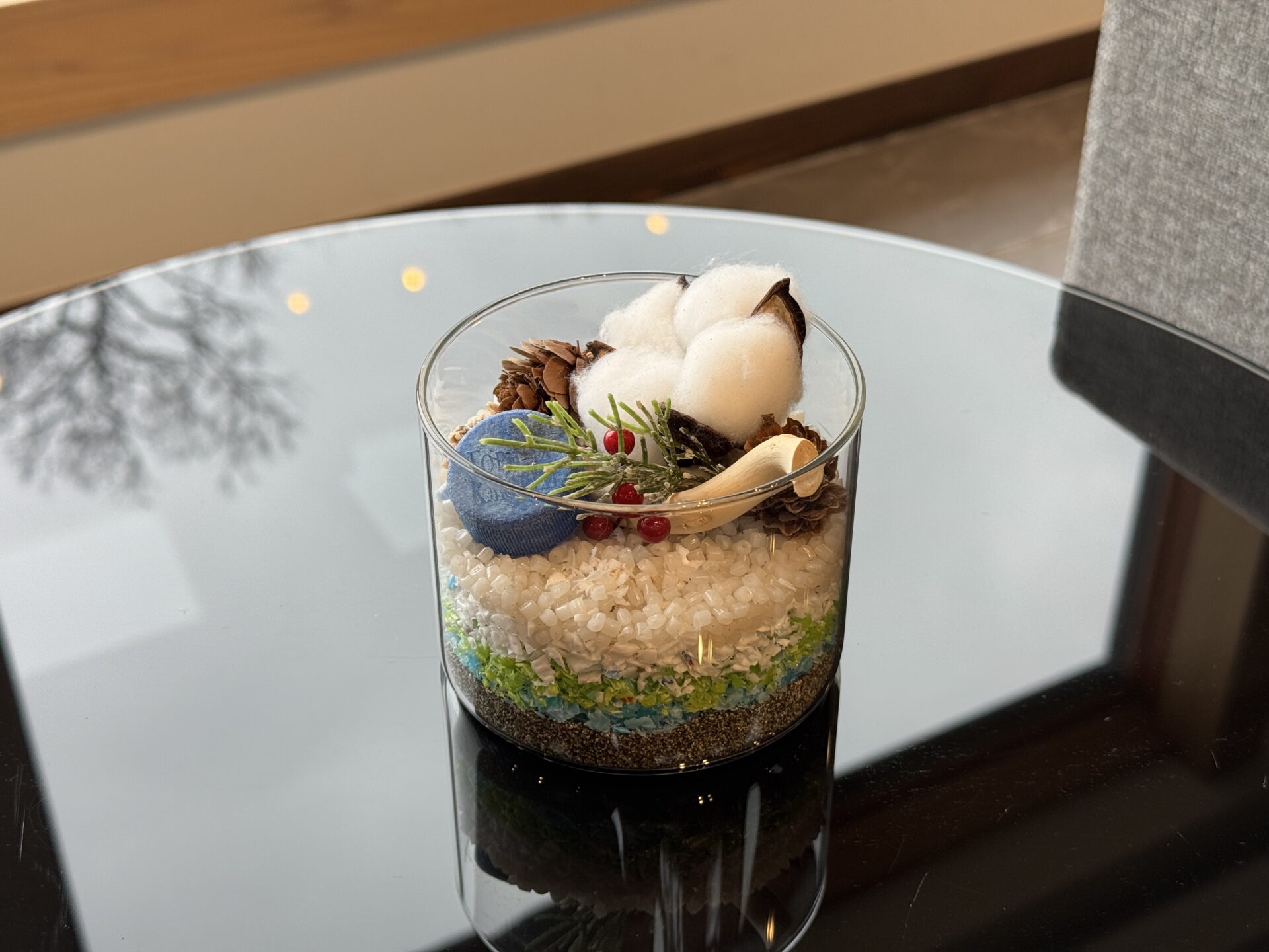 洗浄・消毒済みのプラスチック片(マイクロプラスチック予備軍)を、色とりどりの「絵の具」として使用します。グラスの中に層を描くように流し込み、貝殻やアクセサリーと共に封じ込めることで、世界に一つだけのインテリア・オブジェを制作します。 「ゴミ」が「美しい作品」に変わる体験は、参加者の環境意識にポジティブな変化をもたらします。