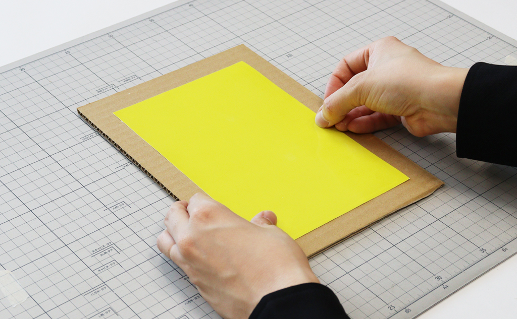 ▲段ボールに表紙を貼り付ける
