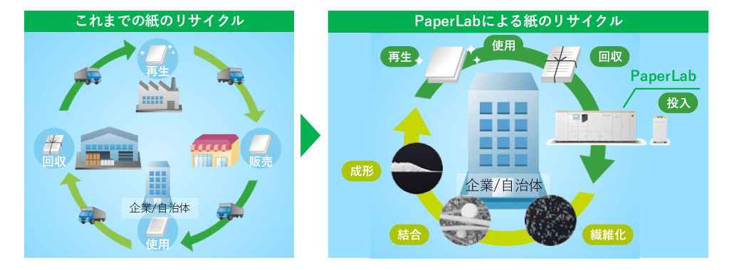 ▲紙における通常の循環サイクルとPaperLab(ペーパーラボ)による循環サイクルの違い