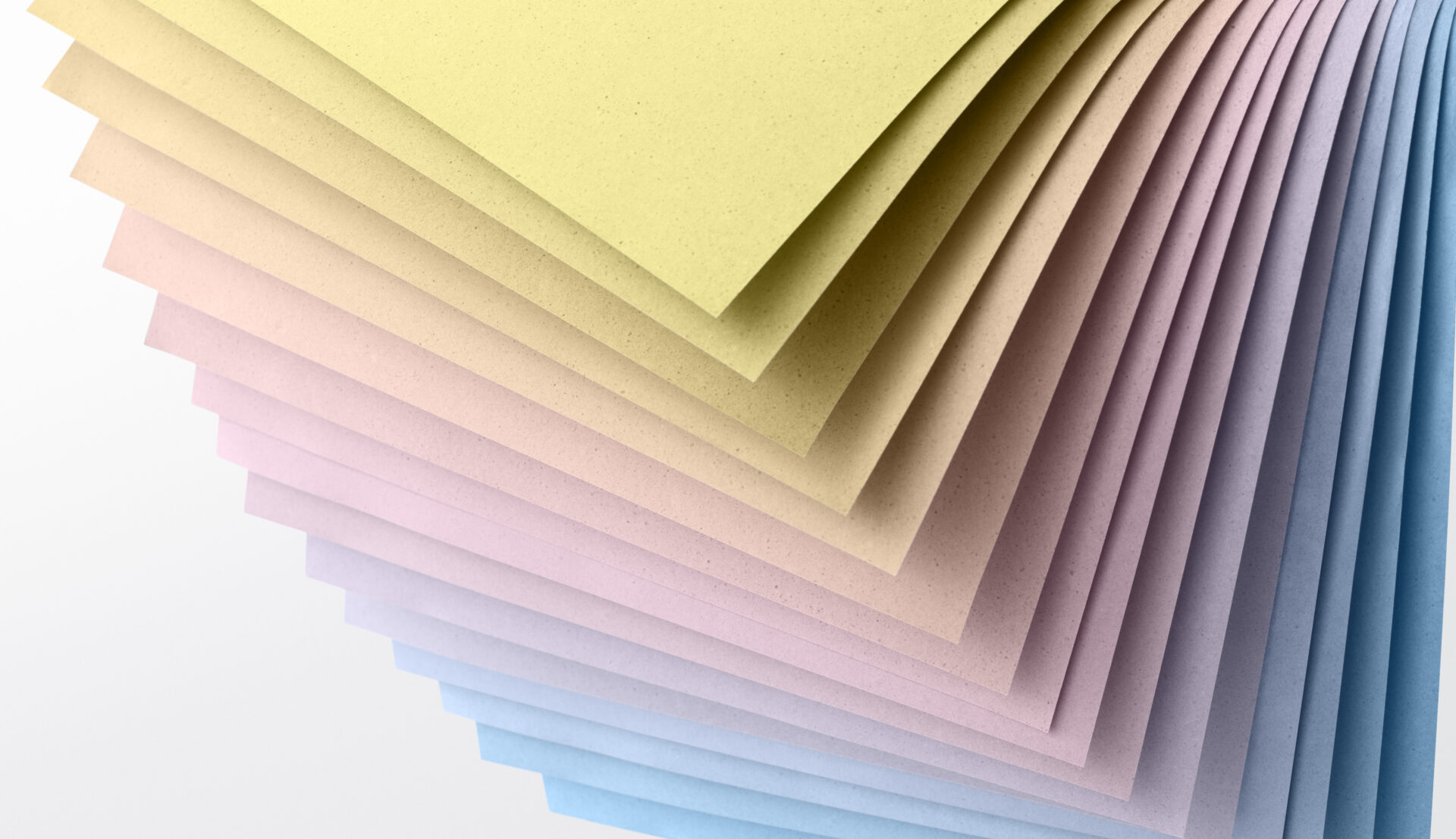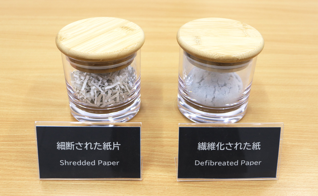 ▲社内の古紙からPaperLabによって製造されたDFP(ドライファイバーペーパー)。白色だけでなく指定した色の再生紙を製造することも可能。