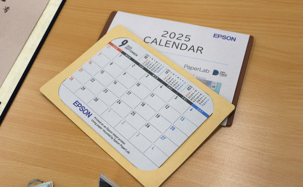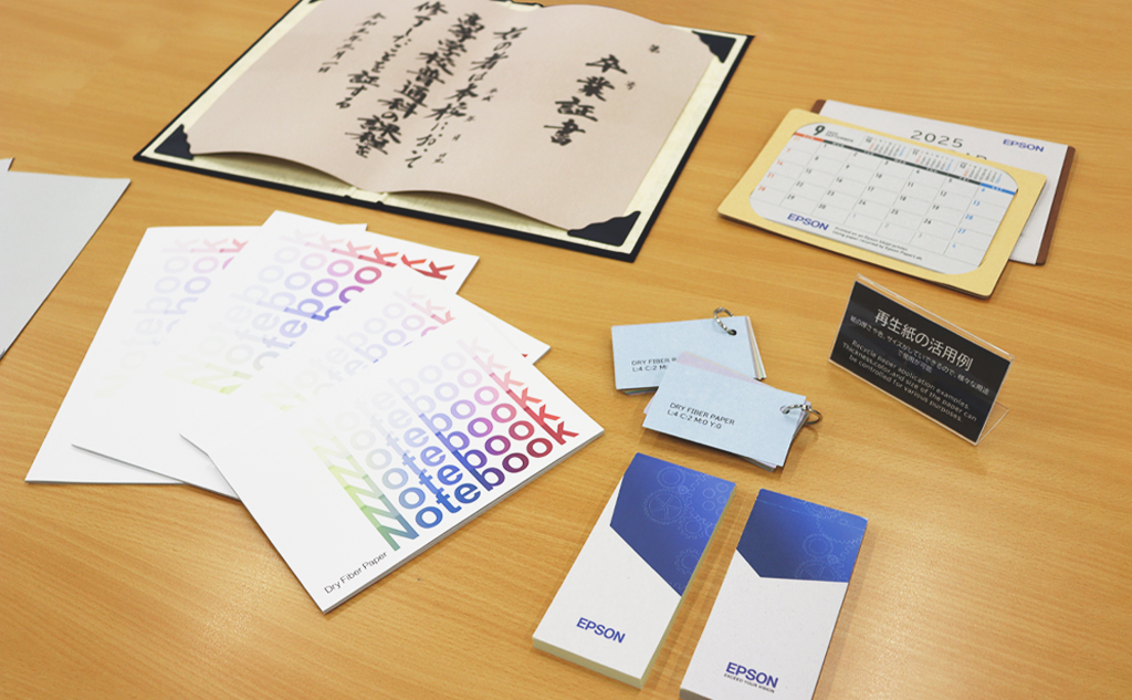 こちらがPaperLabによって製造されたDFP(ドライファイバーペーパー)で作られたプロダクトの数々。社内書類から再生してつくられたノベルティ用卓上カレンダーや、授業の際に使われたプリントを再生して作られた卒業証書など、通常の紙から作られただけでは付加できないストーリーが付加価値となるものも。使い方次第で様々な価値を生むことができるんだホゥ!