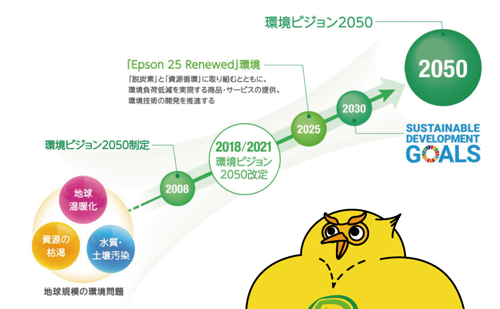 1942年に長野県諏訪地方で創業し、地域と共生しながら自然環境を敬う企業風土で事業活動を行ってきたエプソンさん。1988年には世界に先駆けてオゾン層破壊問題対策の「フロンレス宣言」を行い、地球規模の環境問題へ取り組みを拡大したんだホゥ。経営理念には「地球を友に」を掲げて、使うことで環境貢献につながる商品やサービスを数多く創出し、社会と共に発展する企業を目指しているんだって!