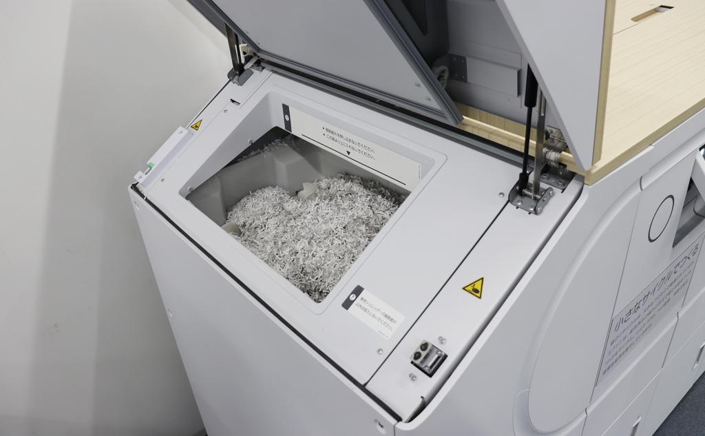 ▲シュレッダーの機能を持つ「紙源プロセッサー Q-40」でできた紙片は「メインユニット Q-5000」内でドライファイバーテクノロジーによってさらに細かく繊維化される。